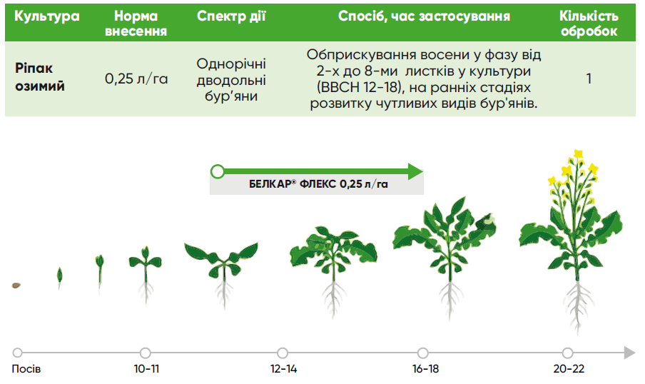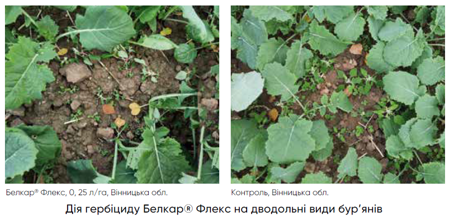 Белкар Флекс, КЕ – післясходовий гербіцид для посиленого осіннього контролю широкого спектра дводольних видів бур’янів у посівах ріпаку озимого з розширеним вікном застосування і додатковою ґрунтовою активністю.