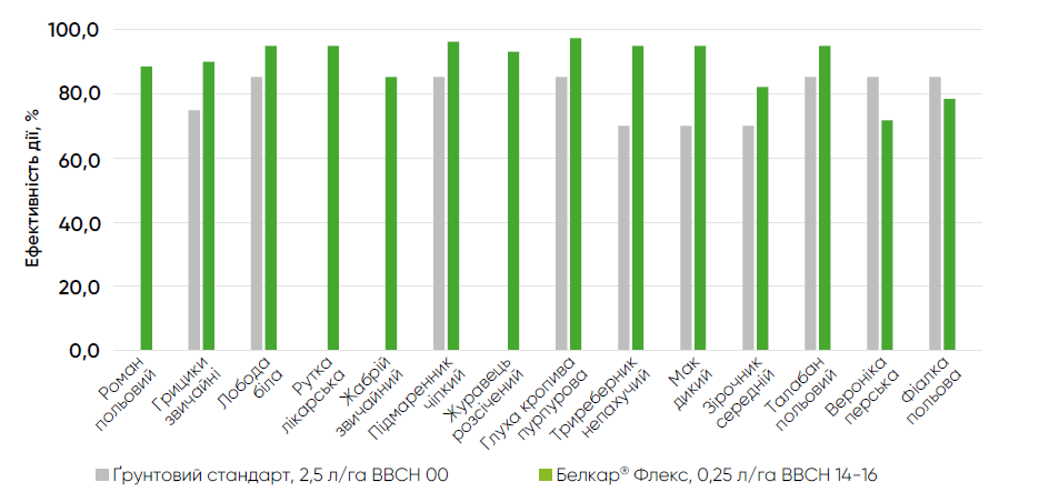 Застосування гербіциду Белкар® Флекс в осінній період забезпечує ефективний і пролонгований контроль найбільш проблемних однорічних двосім’ядольних бур’янів у посівах ріпаку озимого. Не діє на злакові види бур’янів.