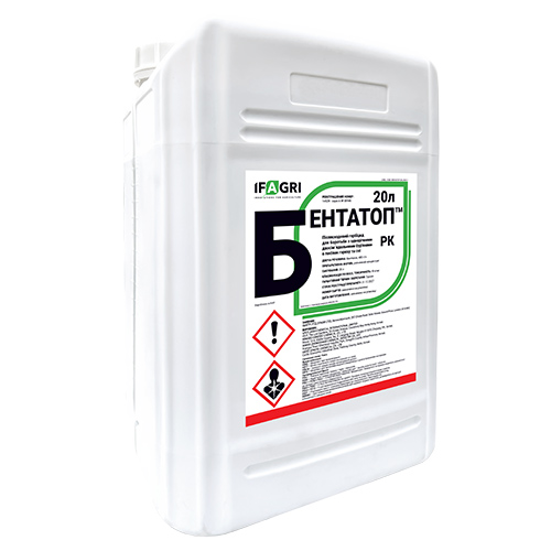 Бентатоп, РК - контактний гербіцид, що поглинається переважно зеленими частинами бур’янів. Діюча речовина препарату бентазон належить до хімічного класу бензотіадіазинони. Має зручну для використання рідку препаративну форму у вигляді водорозчинного концентрату. Бентатоп, РК порушує процес фотосинтезу. Оптимально застосовувати препарат лише після появи сходів бур’янів у початкові, ранні фази їх розвитку. Поглинання препарату відбувається переважно через листкову поверхню.