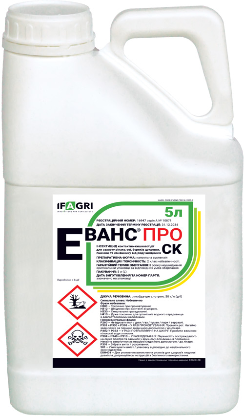 Еванс Про, СК – інсектицид піретроїдної групи у вигляді капсульованої суспензії, діючою речовиною якого є лямбда-цигалотрин.