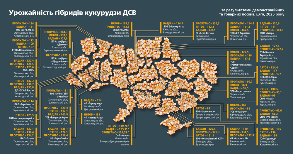Пропонуємо переглянути карту врожайності гібридів кукурудзи ДСВ за результатами випробувань, демонстраційних і товарних посівів у 2025 рр. (ц/га), відкрити у високій якості: