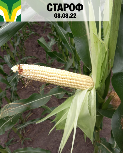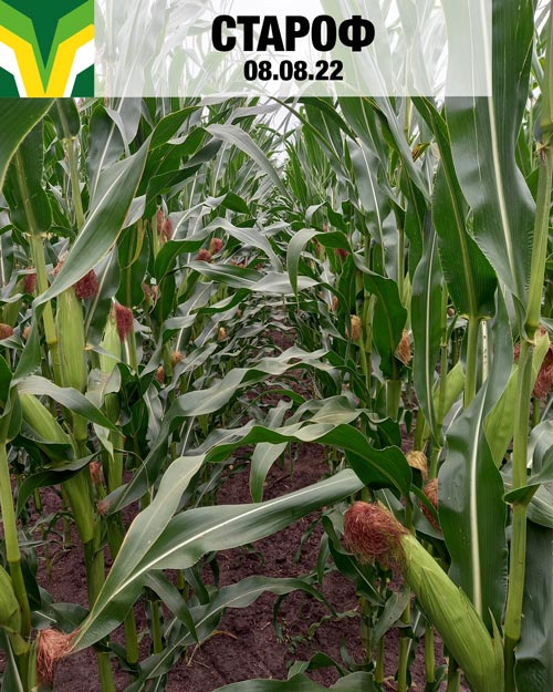 - Староф (ФАО 290) - гібрид перебуває у фазі молочна стиглість, рослина Староф у порівнянні з гібридом Сканер є вищою за 3 м. Також початок має 14-16 рядів та до 45 насінин у ряді. На момент огляду хвороби на кукурудзі відсутні.