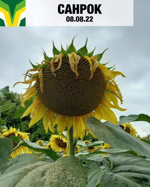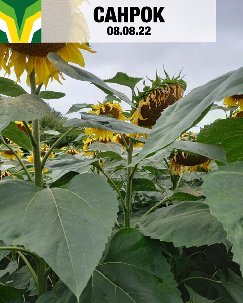 - Санрок - соняшник перебуває у фазі наливу зерна. Висота рослини 2.5 м. Хвороби та шкідники на соняшнику відсутні. Цвітіння пройшло вдало, кошик повністю заповнений.