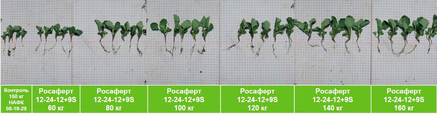 Оптимальним осіннім NPK добривом для припосівного внесення на озимий ріпак є гранульоване добриво для озимого ріпаку Росаферт 12-24-12+9S. Завдяки пролонгованій дії доступного фосфору для рослин, досягається ефект «помпи мінерального живлення», який стимулює розвиток кореневої системи у вертикально низхідному рості, покращує споживання елементів живлення з ґрунту та внесених добрив, а також вологи з нижніх шарів. У свою чергу, швидкий розвиток коренів сприяє більш динамічному набору вегетативної маси, посилює синтез первинних цукрів через стимуляцію фотосинтезу та створює об’єктивні передумови для отримання більшого врожаю.